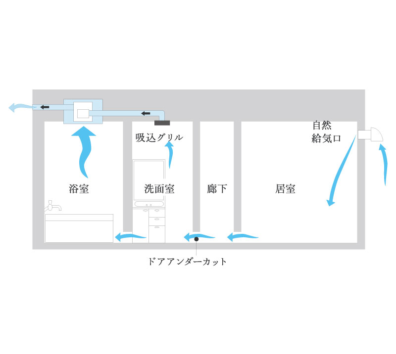 - 浴室換気乾燥機を作動させるとリビング・ダイニングルームや各居室の給気口から新鮮な外気を取り込み、住戸内の空気を心地よく保ちます。