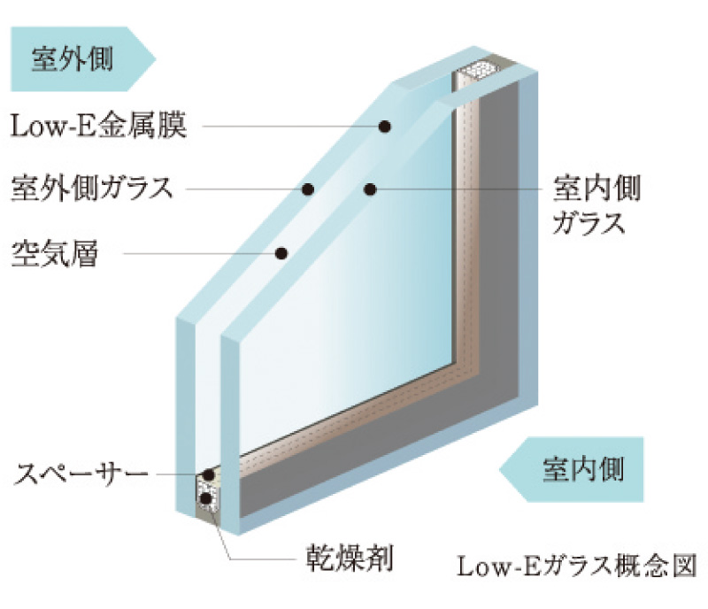- ガラスの間に空気層を設けることで断熱効果があり、省エネに貢献します。