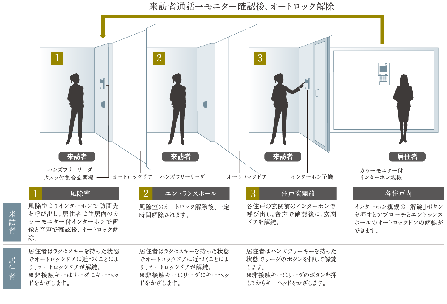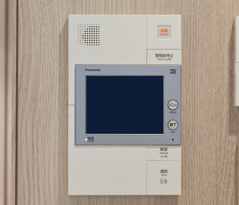 - 風除室とエントランスホールで、セキュリティをかけるオートロックシステムを採用しました。インターホン親機にて風除室のテレビカメラ付集合玄関機で来訪者を確認後、オートロック解錠ボタンでオートロックドアを解錠できます。