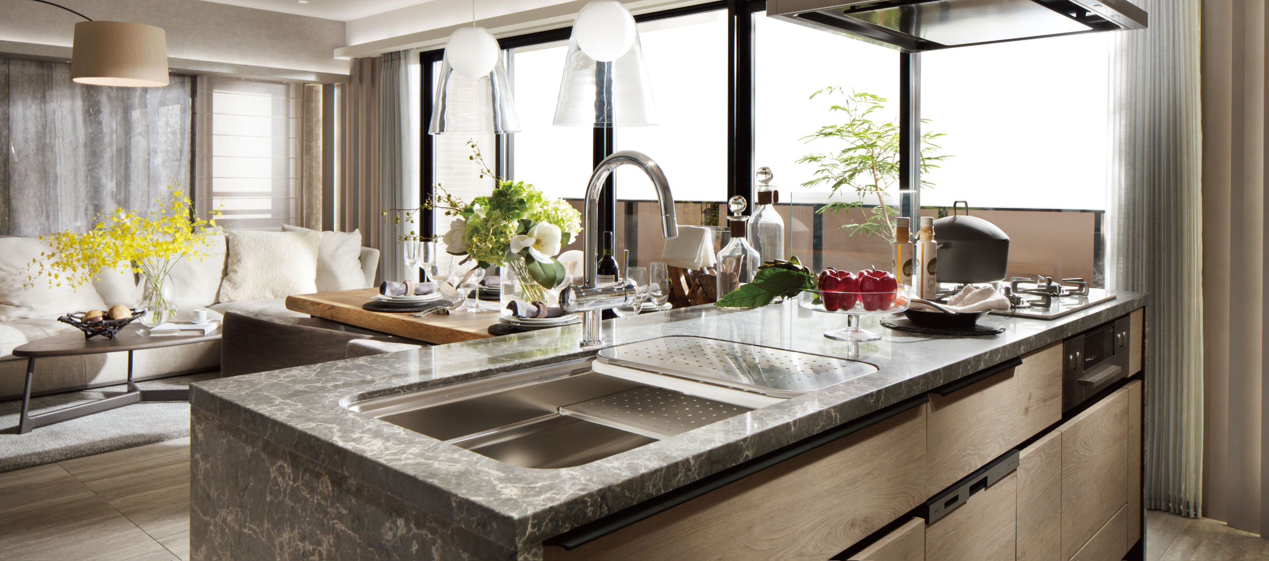 - キッチンのカウンタートップは高級感あふれるクォーツストーンを採用。傷やひび割れに強く、美しさと耐久性を兼ね備えています。※色柄が異なります。