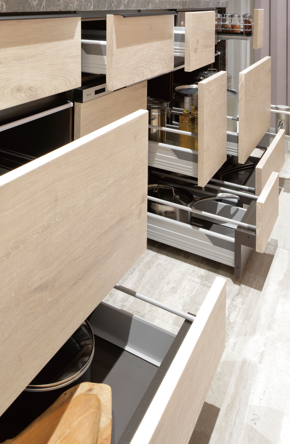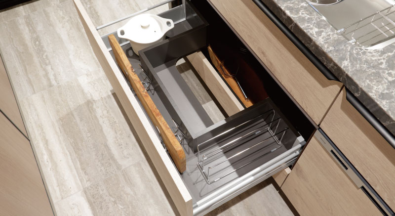 - キッチンカウンターの下には、スライド式で出し入れがしやすく、大容量で機能的なフルスライド収納を採用しています。