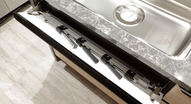 - デッドスペースを有効に活用した包丁差し。かがまずに包丁を取り出せる高さにあるので作業がスムーズです。