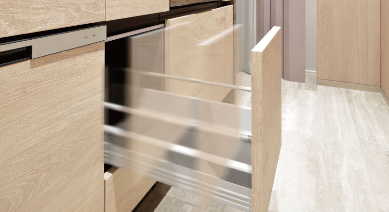 - 引き出しを軽く押すだけで穏やかでスムーズに閉まるので、衝撃・音を軽減すると共に指挟みが防止できます。