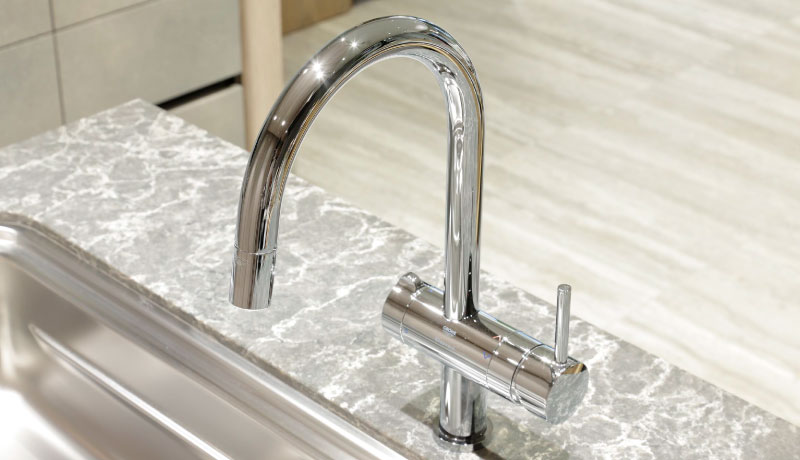 - キッチン水栓は上質なデザインと高機能を両立させたアンダーシンクタイプ複合水栓。ホースを引き出せるのでシンク内の洗浄も簡単です。(三菱ケミカルクリンスイ・グローエ共同開発)