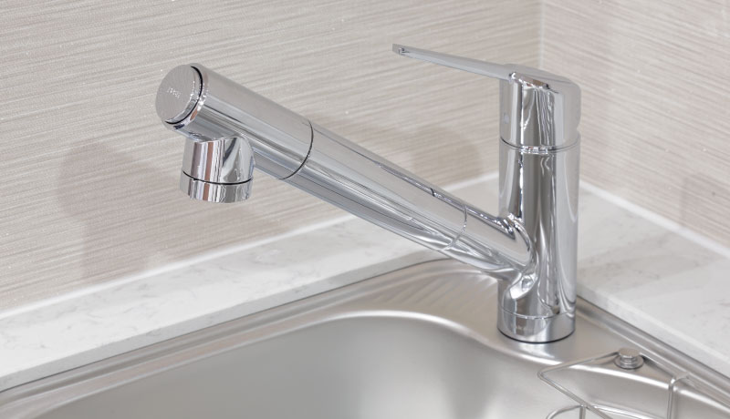 - キッチン水栓は、ホースを引き出せるのでシンク内の洗浄も簡単です。浄水・原水のワンプッシュ切り替えや浄水シャワーなど、使い勝手に優れた水栓です。