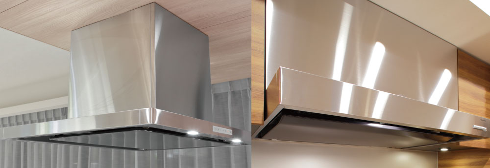 - 吸い込み力がある整流板付レンジフード。汚れやすい吸気口も簡単にお手入れできます。※タイプ・セレクトによってレンジフードの種類・大きさが変わります。※A1、A2、B、Cタイプはブーツ型になります。