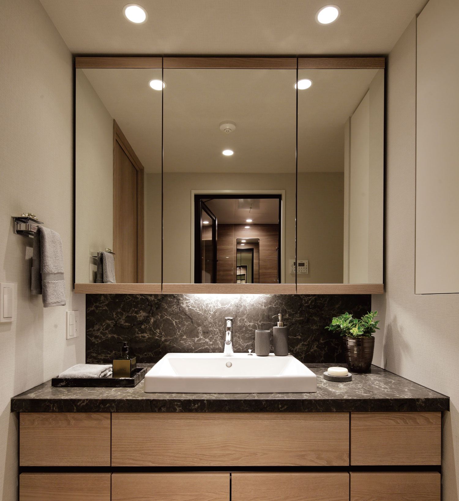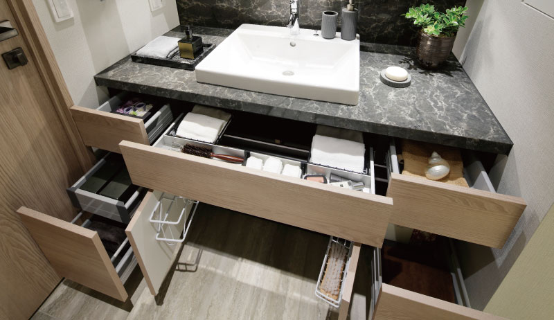 - 排水口を奥に設けることで下部収納スペースを広く確保。ヘアケア機器や、細かいメイク用品などが整理できるスリム収納をはじめ機能的な収納を叶えます。