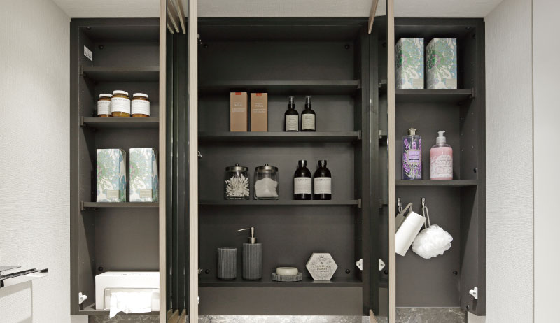 - 三面鏡の裏側はブラシや化粧品・洗面具などがすっきりと収まる便利なスペースです。