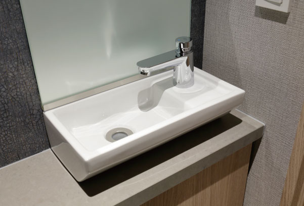 - 水栓と鏡をセット。ゲストが人目を気にすることなくお化粧直しができます。水栓はデザイン性が高いドイツ・グローエ社製自閉式単水栓です。