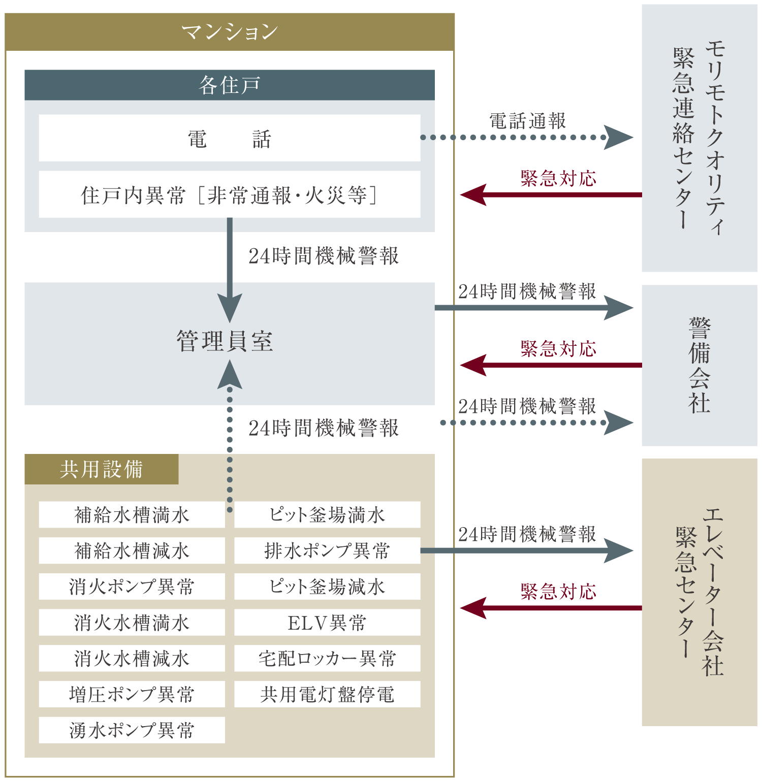 - 都市生活の安心と安全を確保するために、24時間セキュリティシステムを導入しました。各住戸から異常信号が発信された場合には、24時間体制でスタンバイする警備員が現場へ出動。建物内の各種設備(各ポンプやエレベーターなど)の異常発生の場合も緊急要員が現場へと出動し、復旧作業を行います。※住戸内の非常警報は警備会社へ通報されます。