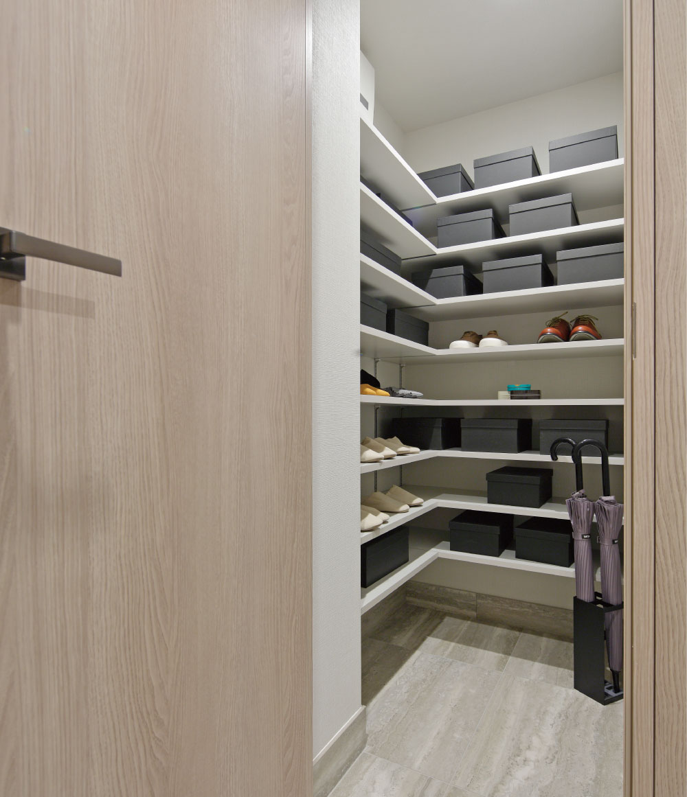 - 玄関横には大容量のシューズインクローゼットをご用意。靴を履いたまま入れ、アウトドア用品など外で使用するアイテムの収納にも便利です。※一部住戸のみ。※タイプにより形状が異なります。