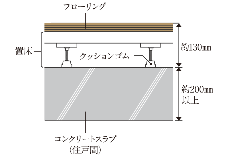 - 住戸間の床コンクリート厚みは約200㎜以上
