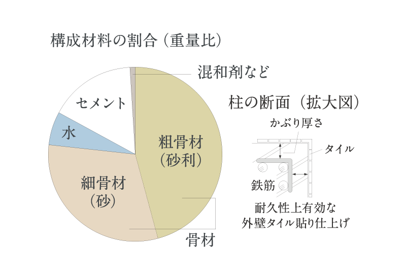 - 水セメント比を50%以下(杭及び非構造体コンクリートを除く)に設定。かぶり厚さもJASS5(建築工事標準仕様書)に準拠した高い耐久性をクリアしています。