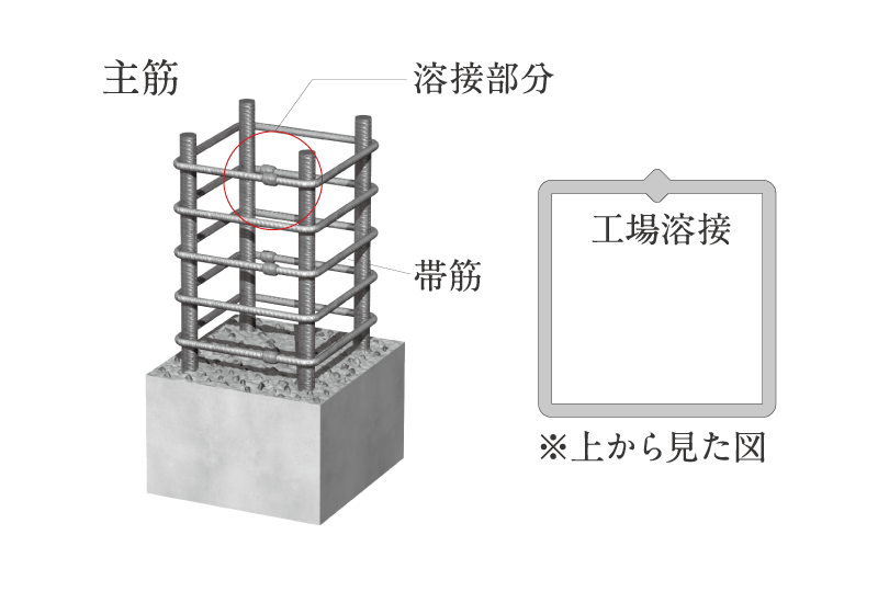 - 工場で特殊溶接により継ぎ目を閉じた形へ加工した帯筋です。コンクリートを拘束する能力が高く、一般的な帯筋よりも大地震時の粘り強さに優れています。(柱と梁の接合部分除く)