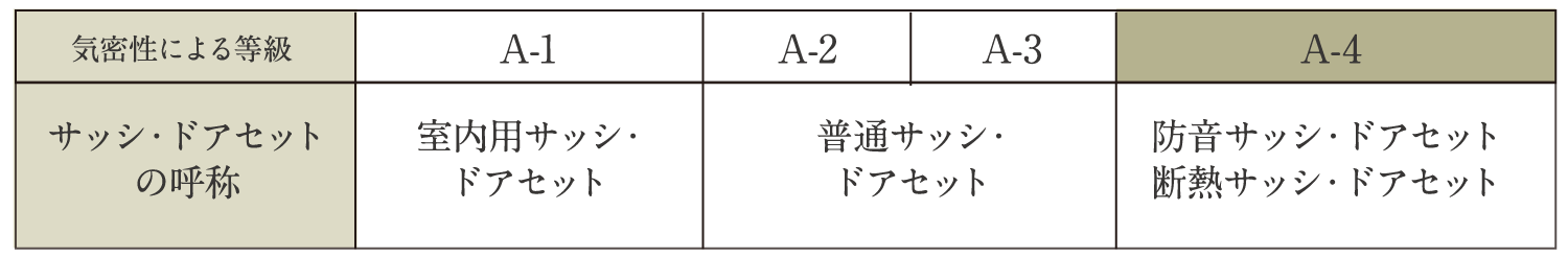 - アルミサッシについては、気密性に優れた気密等級A-4(JISA4706)を使用しております。【選定の目安】サッシ・ドアセットの気密性は、求める居住環境により選定します。