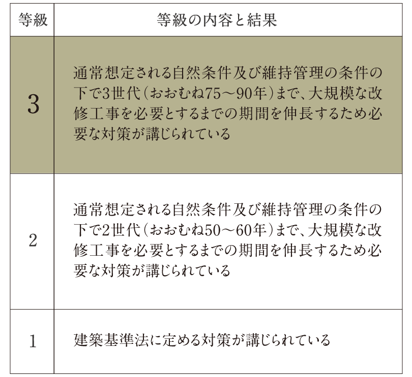 - 住宅性能表示制度における劣化対策等級で最高の「3」を取得。概ね75~90年の耐久性を実現しています。