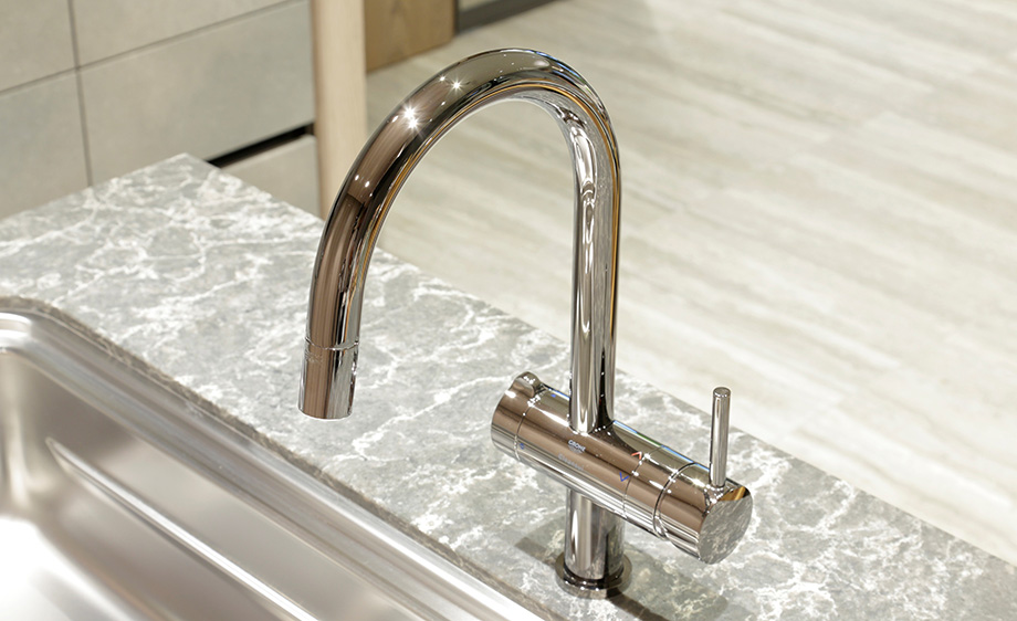 - キッチン水栓は上質なデザインと高機能を両立させたアンダーシンクタイプ複合水栓。ホースを引き出せるのでシンク内の洗浄も簡単です。※D・Eタイプ