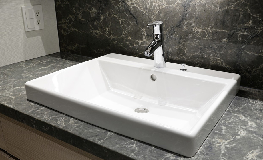 - キッチンのカウンタートップは高級感あふれるクォーツストーンを採用。傷やひび割れに強く、美しさと耐久性を兼ね備えています。※色柄が異なります
