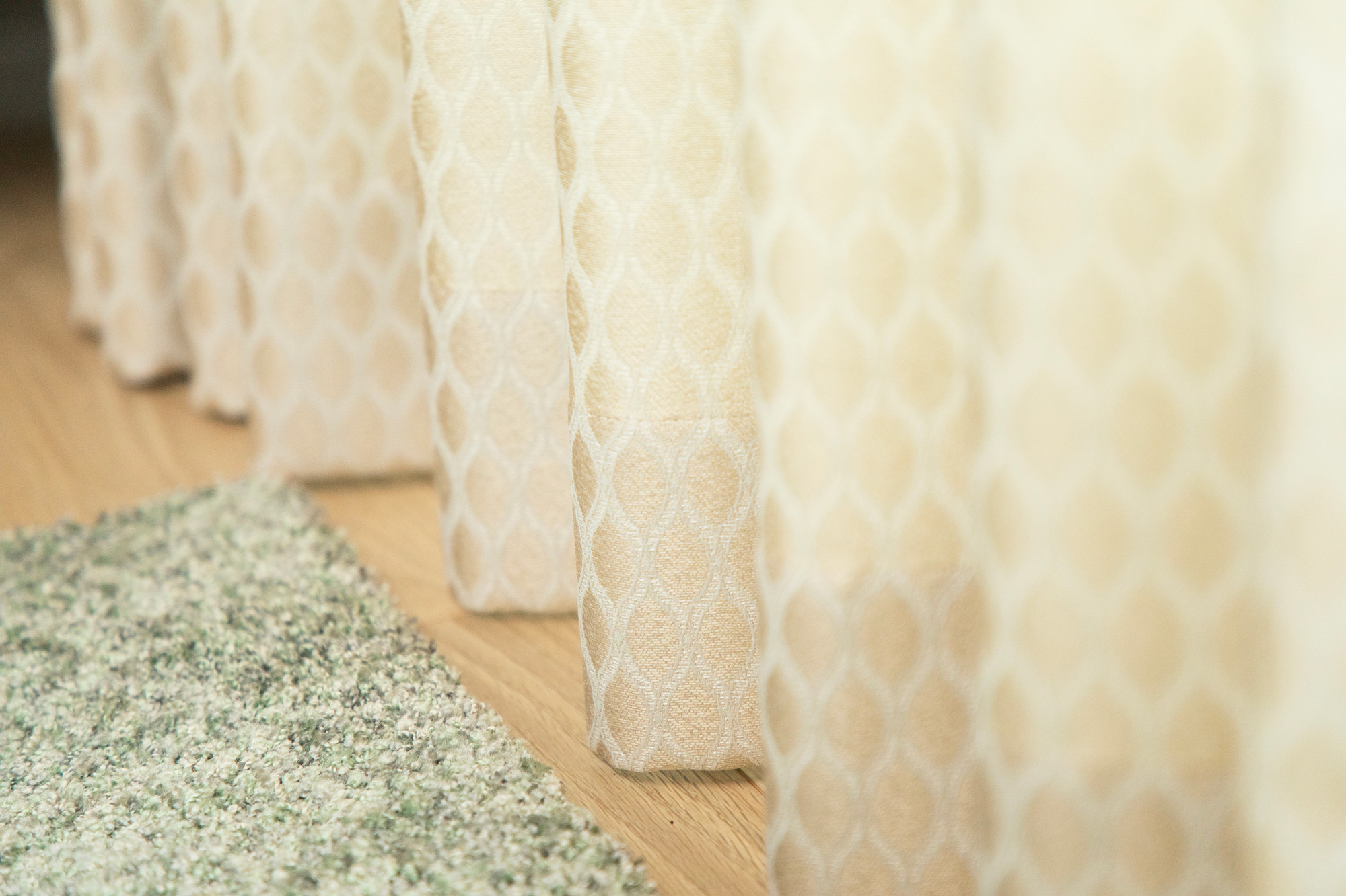 大きな窓の明るい印象を残したかったというリビングのカーテンは美しいツヤのあるエレガントな柄をセレクト。