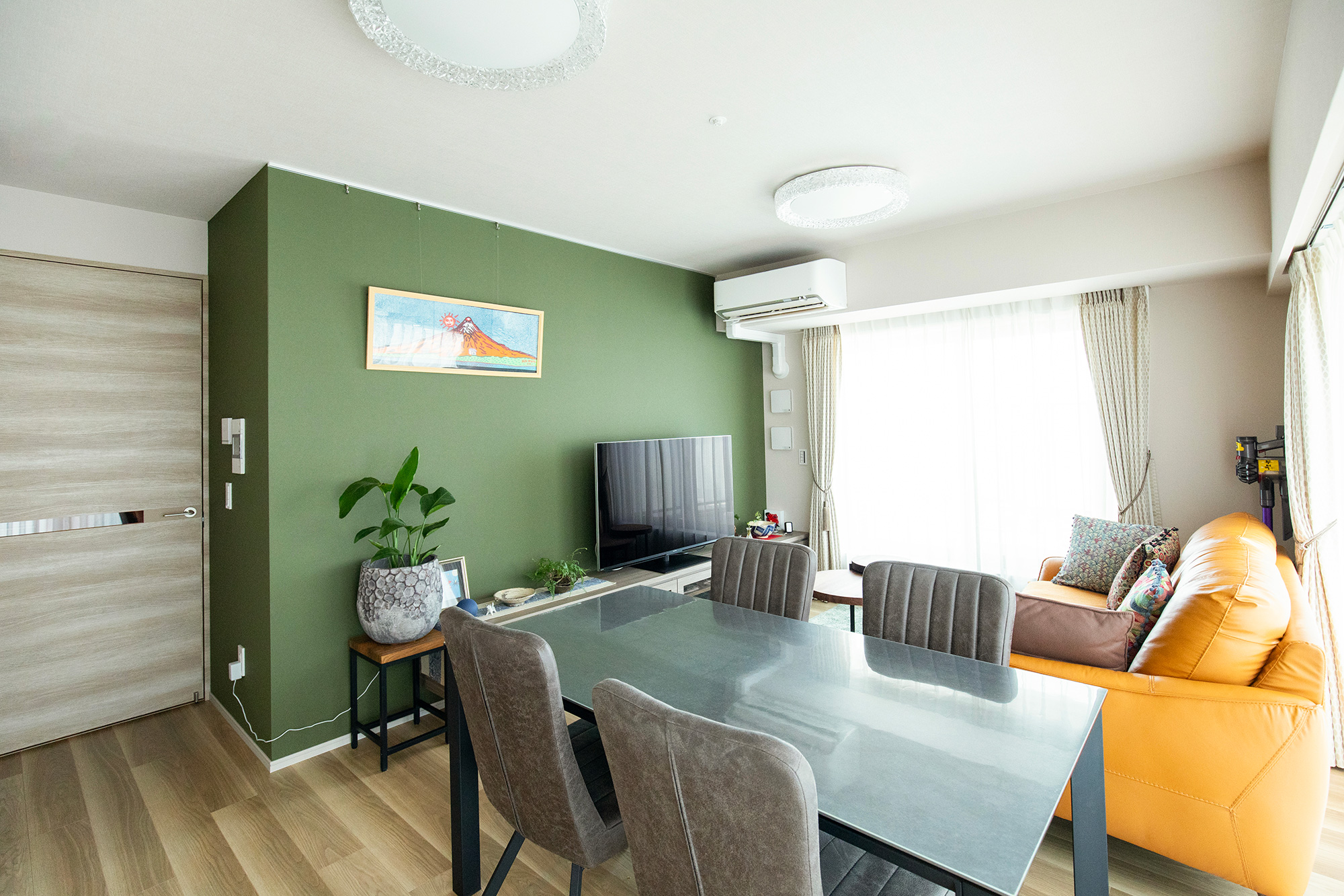 リビングにはグリーンのアクセントクロスで、明るさと落ち着きの両方を感じられる空間に。