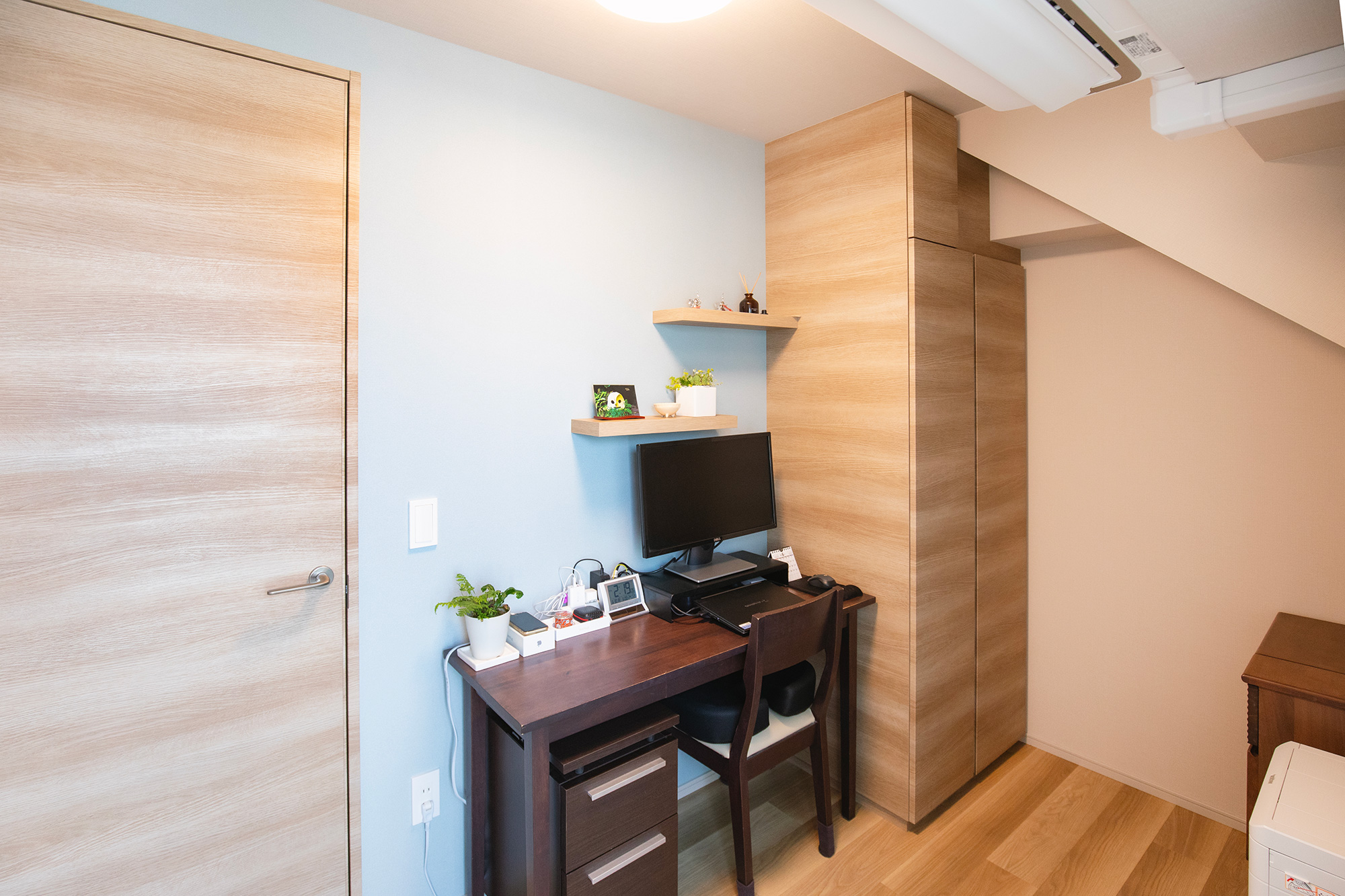 奥様の仕事部屋には、ブルーのアクセントクロスをセレクト。選んだ色味は、建具の淡いブラウンにも自然になじみます。カーテンはシルバーがかった色味で、クールな印象も感じさせます。