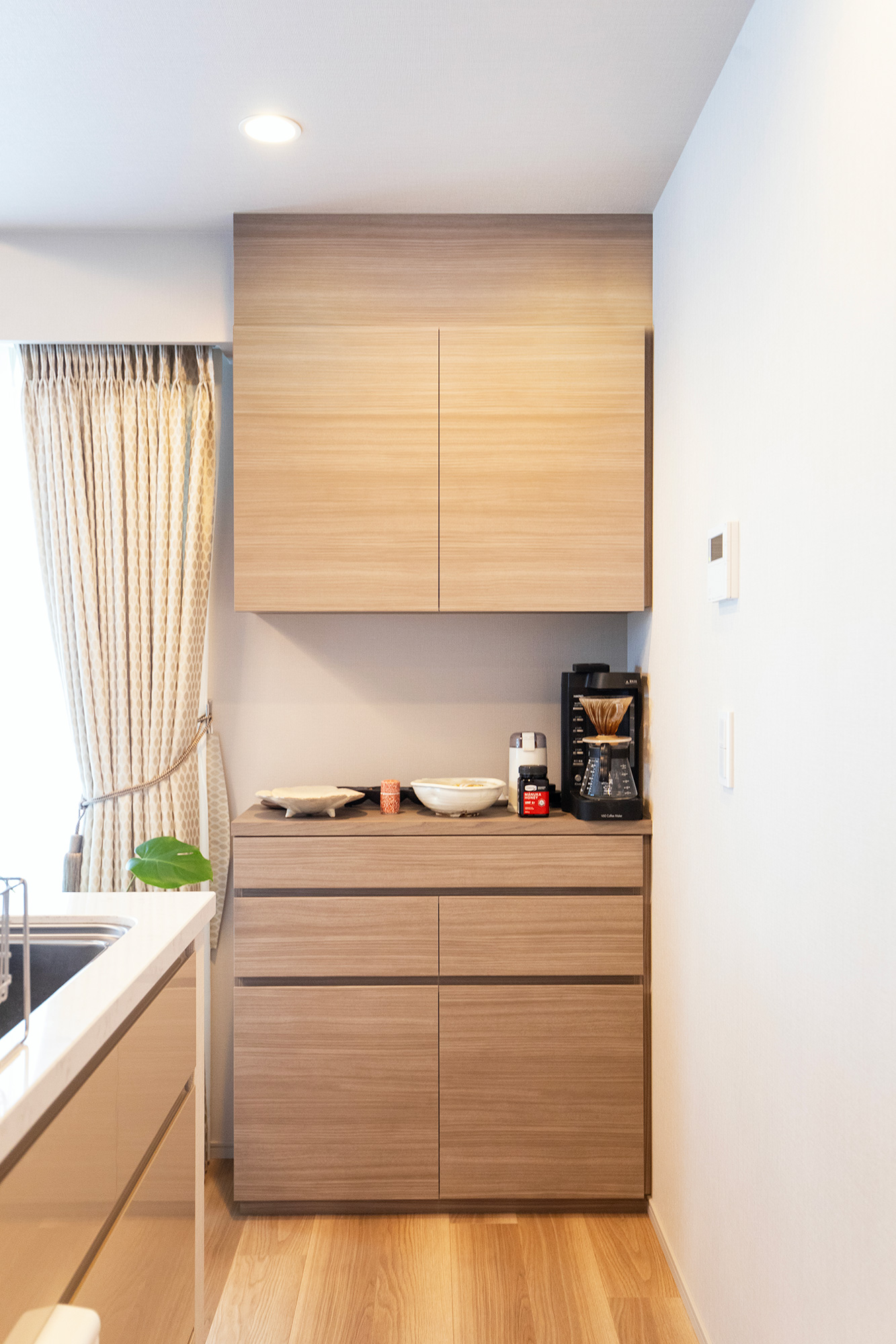 スッキリと暮らしたいというお二人は、収納も重視していらっしゃいました。そこで、スタイルオーダーのインテリアオプションを活用して、キッチンや書斎に収納棚を注文されました。「統一感を持ったインテリアにしたいという思いがあり、トータルで考えた時にやっぱり作っていただいた方が良いだろうと思ったんです」(奥様)。何かの拍子に棚が倒れてしまうリスクを考えると、防災面でも安心感があるということもお話されていました。