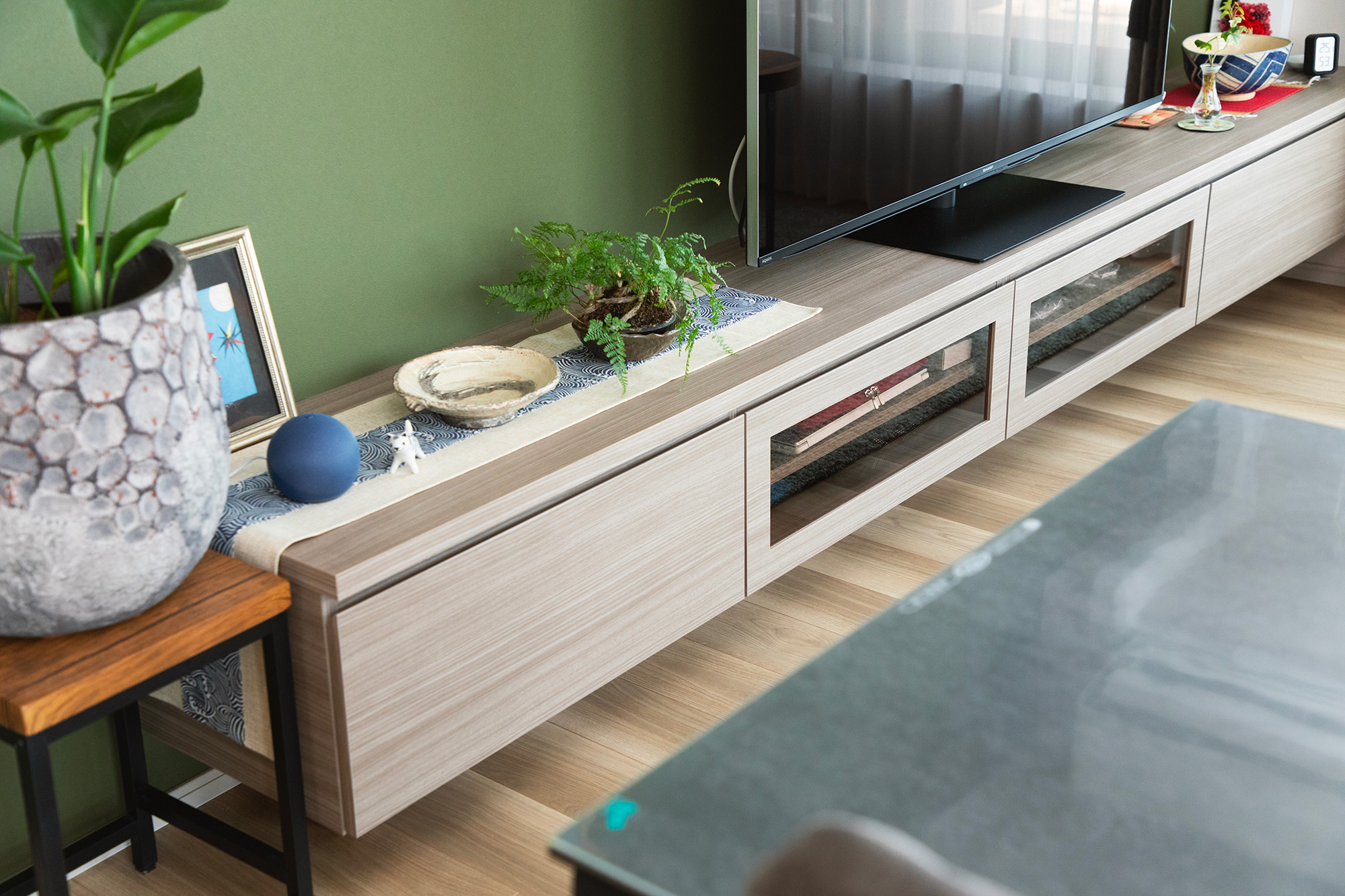 その中でリビングはお客様が来る場所であることも考え、窓の広さからうまれる明るさを活かし、照明やカーテンも光を引き込むようなものを選ばれました。一方で、目を惹くのはリビングに施されたグリーンのアクセントクロス。「リビングは、長く過ごす場所。明るいだけよりも落ち着いた色味でひき締めて、空間に静けさを持たせたかったんです」(ご主人)と、T様ご夫妻ならではのバランス感覚が光るセレクトです。