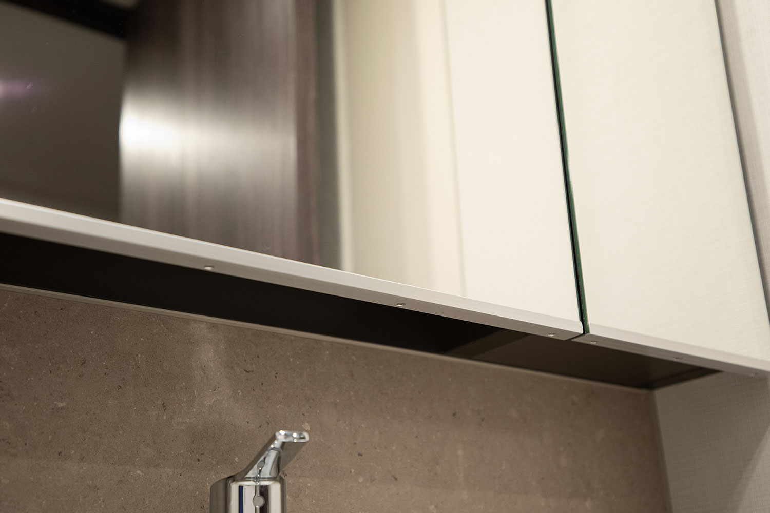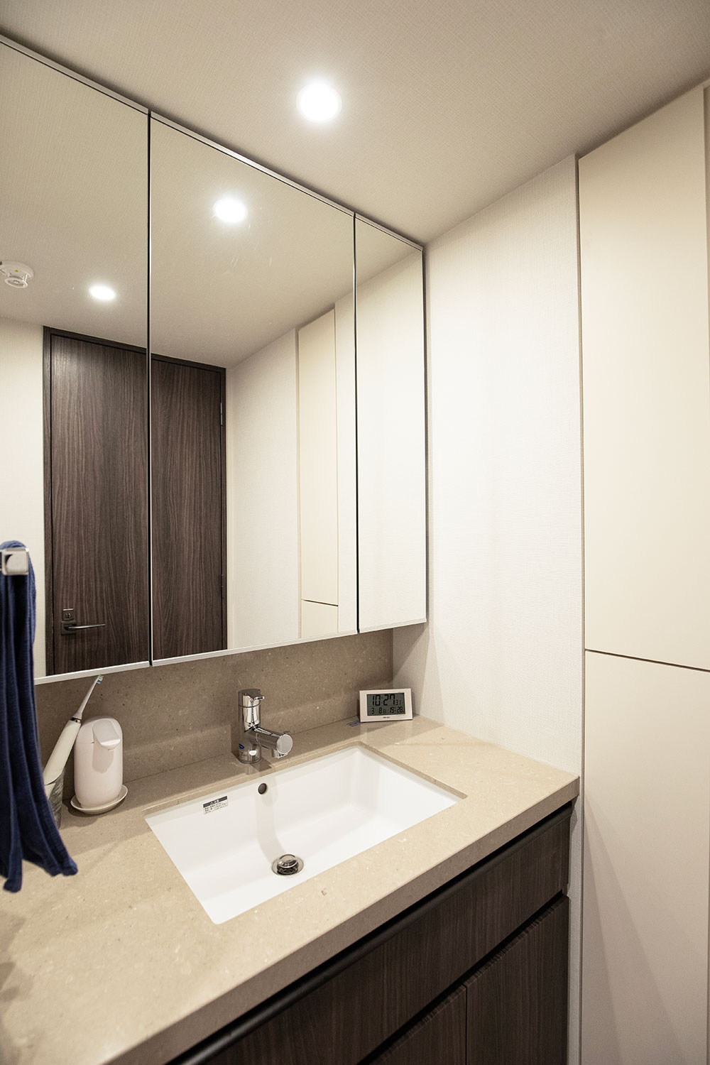 全体に統一感をもたらすため、洗面台もお好みに合わせてクオーツストーンへアップグレードされました。タイル貼りだったミラーキャビネット下部の壁面も洗面台と同じ素材へ統一し、木枠のミラーフレームはアルミ素材へ。清潔感とモダンさが共存する空間へと仕上がっています。