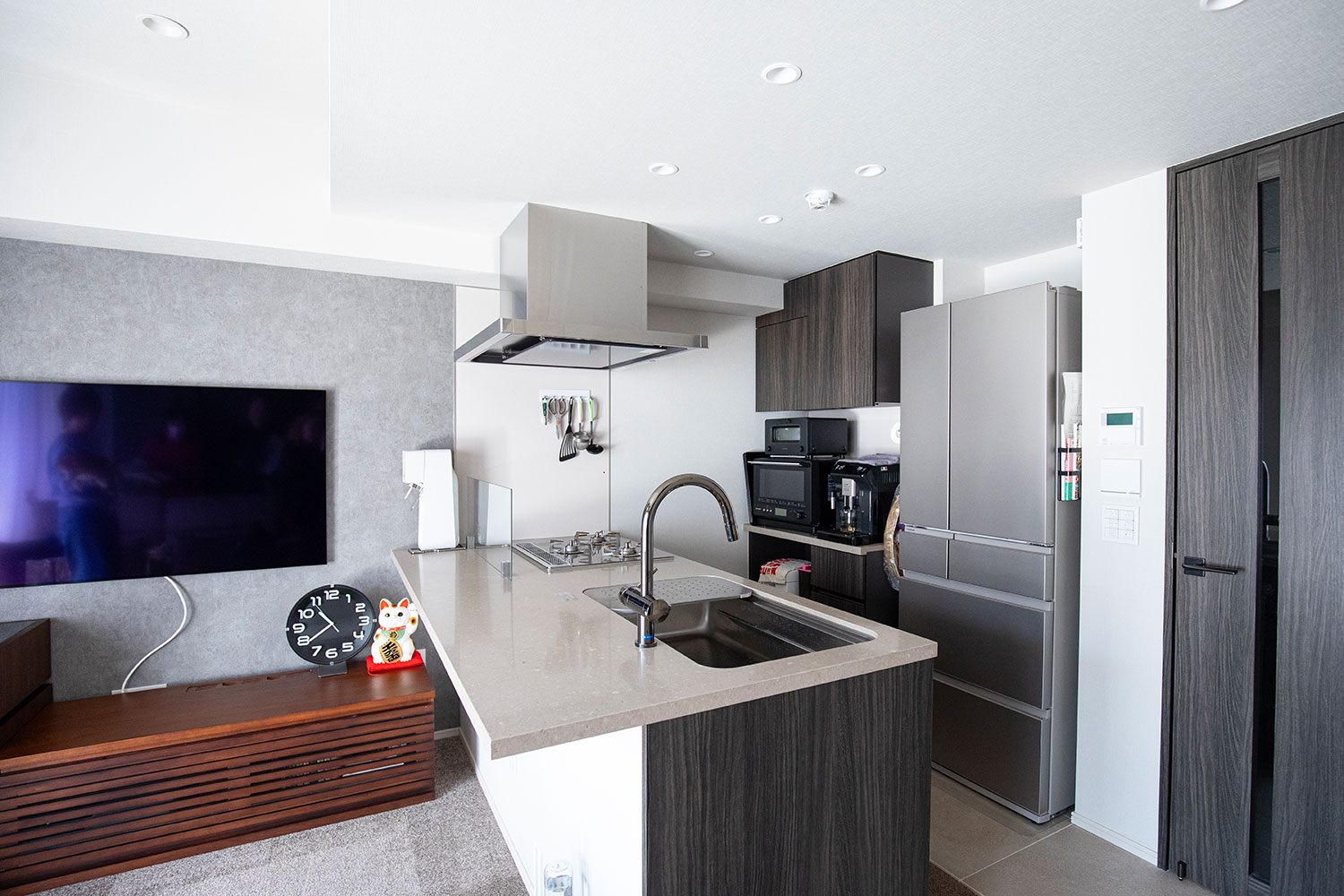 家づくりの際、ご夫婦の中で一貫していたのは、シックで落ち着く雰囲気にしたいということ。色合いを意識したことで、全体のトーンが調和し、温かみのあるブラウンとシックなグレーが美しく響き合う空間ができあがりました。