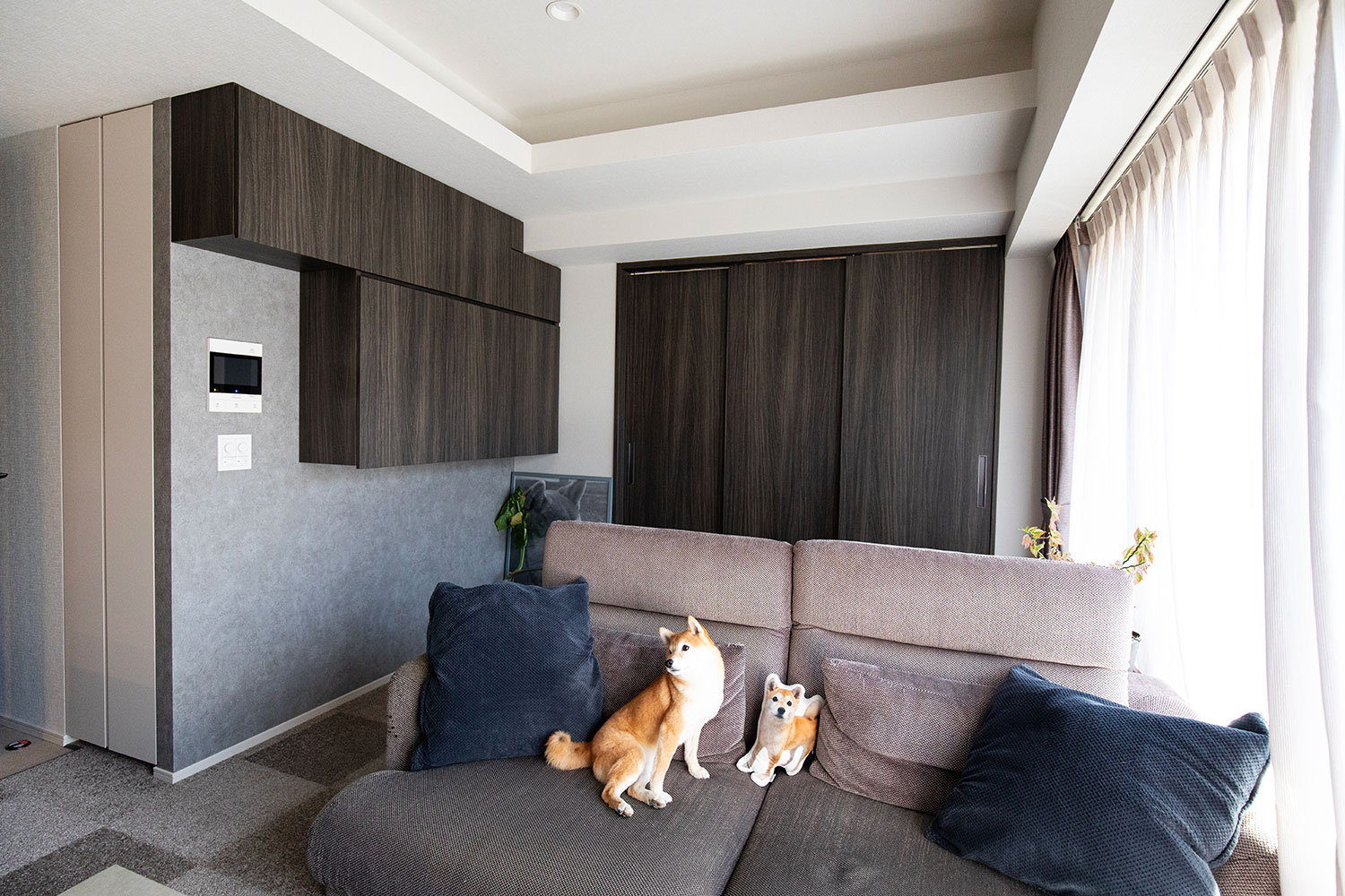 愛犬もくつろげるリビング。写真左手の吊戸棚はスッキリとした印象ながら収納量を確保