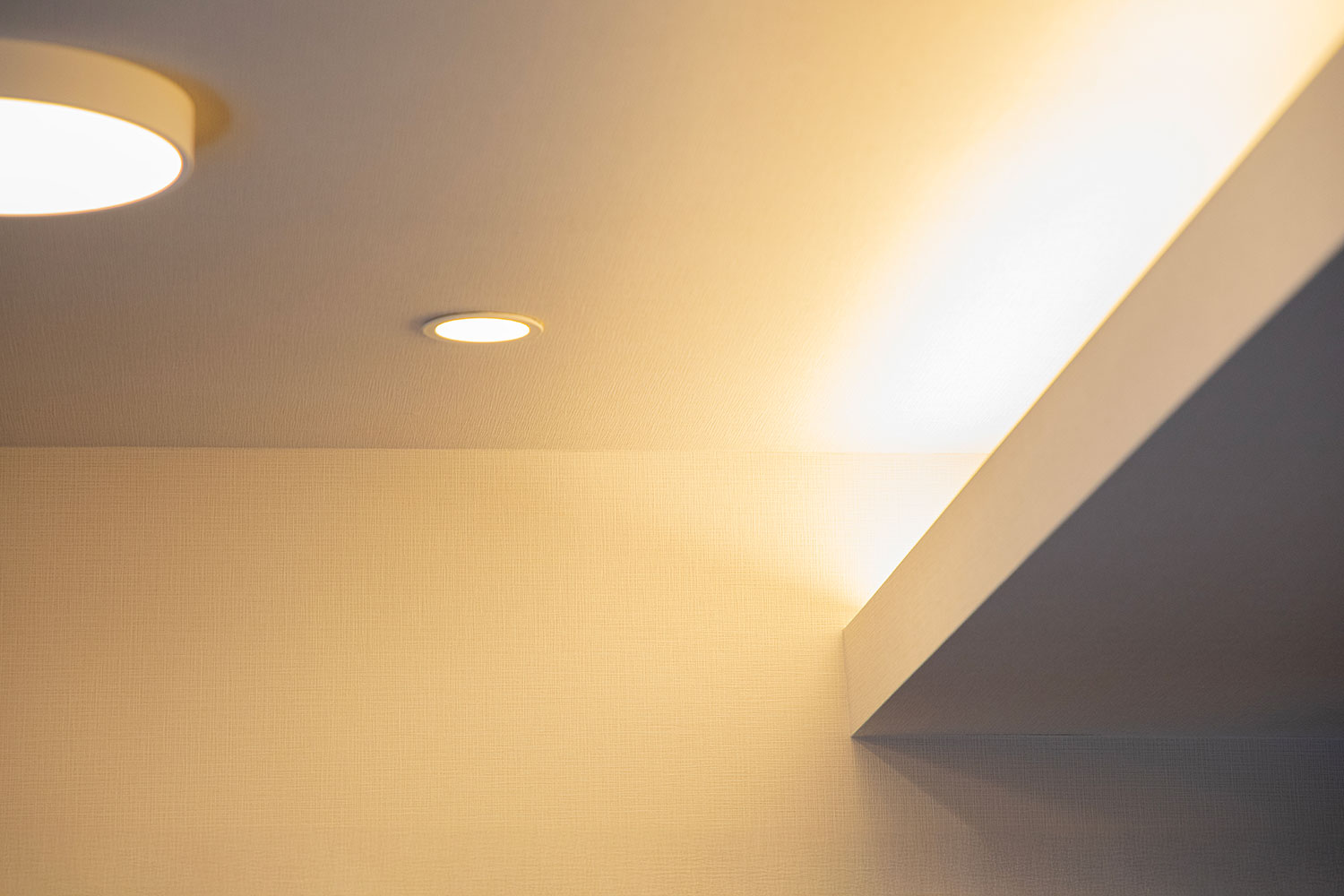 完成した折り上げ天井は、光をやわらかく受け止めて反射し、空間に奥行きをもたらします。