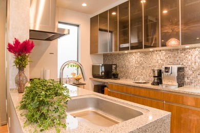 93%が水晶からなる美しいクオーツストーンのキッチンカウンター。奥行きを65から90センチにサイズ変更して幅を広くしている。キッチンスライド収納も実用的だ。
