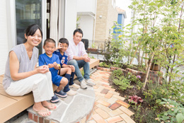 プロの手によって造園された庭を望む縁側のようなウッドデッキは、ご主人の安息の場。お気に入りの家で、豊かな時間を過ごされているI様ご一家。
