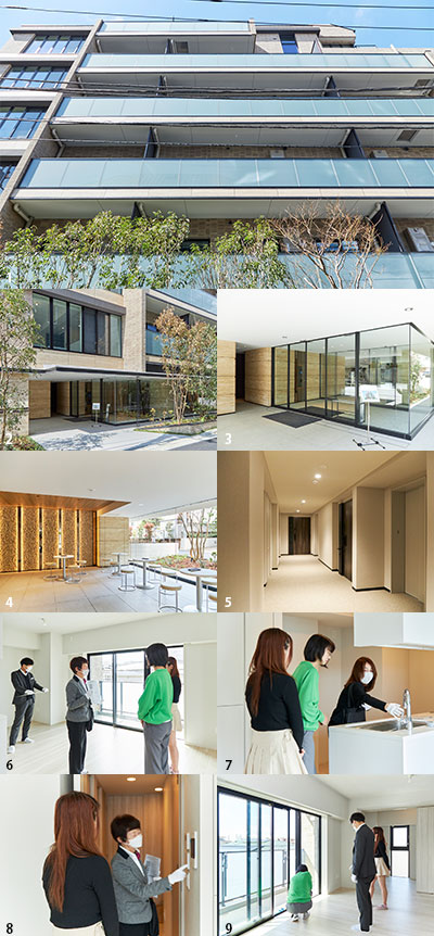 落ち着いた邸宅街である東北沢にふさわしい、都会的でモダンな建築美を目指しました。ファサードはせっき質タイルのマリオンと全面ガラスウォールで構成。周囲の街並みとの繋がりを大切にしながら静かに佇む風景をデザインしています。エントランスの壁には大理石のトラバーチンを配すなど、自然素材を多用して上質で優しさのある表情を創出。エントランスホールでは、ブラックミラーのスリットのある岩肌仕上げの御影石の壁をアイキャッチにして構成。陽射しを取り込む大きなガラスウォールが、内と外を一体となった開放的な空間をデザインしています。新しい時代を見据えながら、新しい価値観をも感じさせるレジデンスになったと思います。