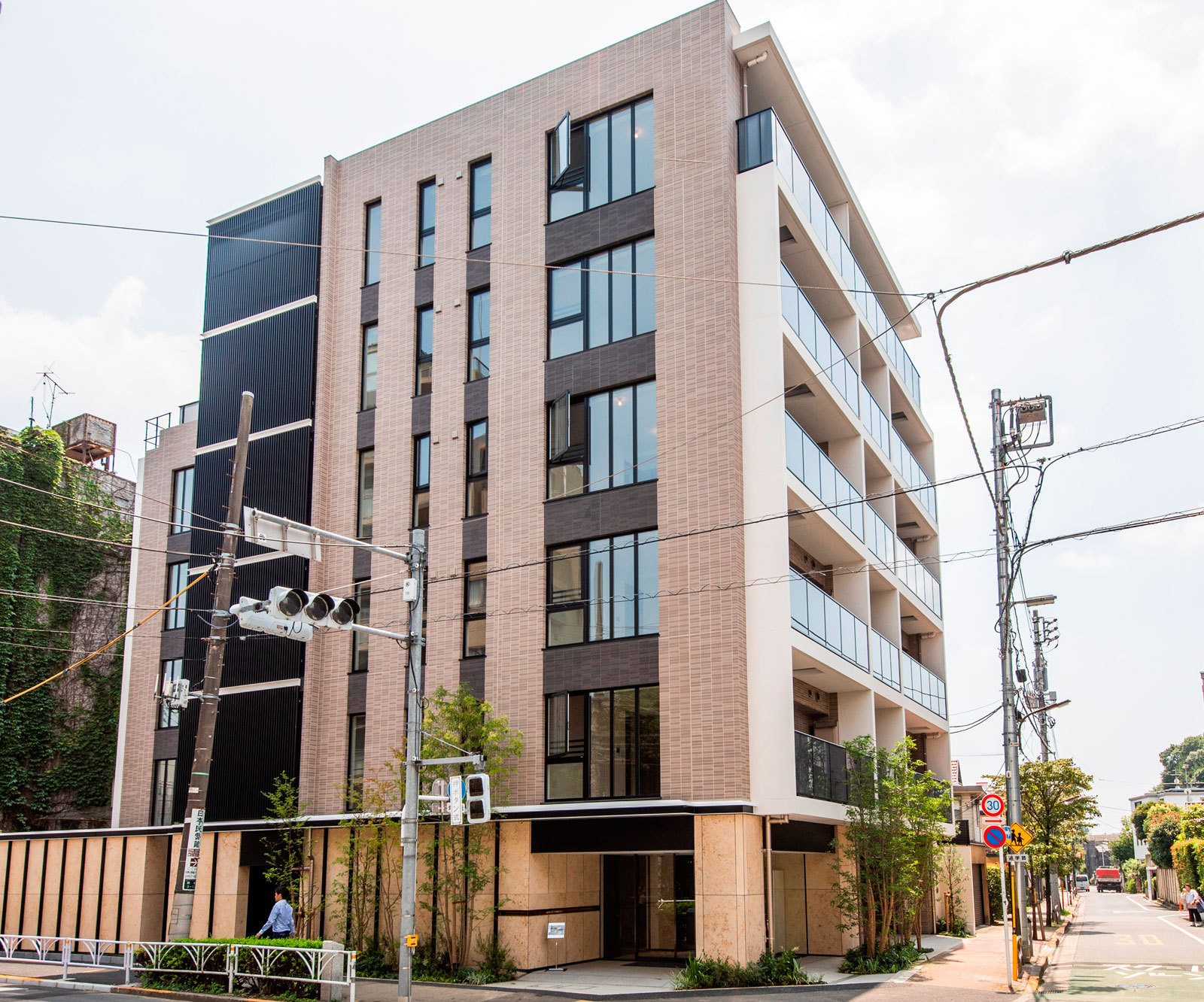 駒場通りに面した角地の恵まれた立地に、価値あるモダンな建物を完成させることができて達成感でいっぱいです。外観の基壇部には大判ライムストーンを用い、2階以上はせっき質タイルと開口部の大きい窓ガラスで構成し、縦のシャープなラインが特徴の美しい建物です。ラウンジ内の正面には特殊加工した大理石を施し、壁面の大判ライムストーンや御影石の床など、異なる素材の組み合わせで上質な空間を演出しています。素材の選別も設計と一体となって選び抜いており、施工の立場としてもよい仕事ができたと思っています。この質の高い美しい住まいで充実した暮らしをしていただけることを願っております。