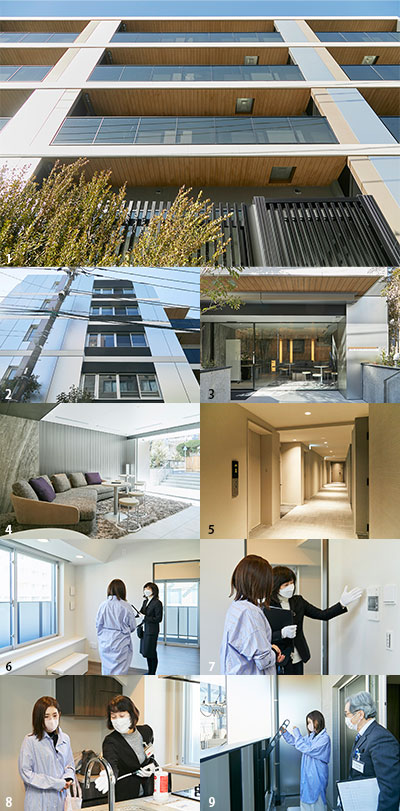 碑文谷という落ち着いた街にふさわしい、住まう方の誇りとなるような住まいを目指しました。外装には反射が強いアルミの大きなパネルを使用し、モダンでインパクトのある外観を表現しています。それぞれの階層との相乗効果も考えて、白いタイルの横ラインを通して全体をさらに美しくまとめています。バルコニーの軒天は、自然の風合いを感じるように木調仕上げで施工。コモンスペースへのアプローチは、ガラスの扉だけにして前庭とのつながりを感じながら、外と内との連続性を高めています。ラウンジは大理石模様の大判タイルと金属製パネルが、寛ぎを感じられるモダンな空間を創出。ダウンライトの照明の中で、窓外の木々の緑も眺めることができます。碑文谷という地に、新たな景観美を築けたと思います。