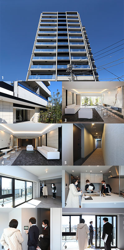 駅から3分という近さながら、海を望めるロケーションという立地を活かして、上昇感のあるスマートな造形美を表現しています。建物の中心を1階から最上階まで貫くようなコンクリート打ち放しのマリオンや透明感のあるガラスが、モダンでシャープな佇まいを見せています。エントランスホールも間接照明を多用することで、落ち着いたシックな空間を創出。ソファのある背面壁には大理石風の大きなタイルを配して「海らしさ」も演出しています。また、日本庭園のような景石(自然石)を配した植栽が建物の景観を高め、エントランスホールの窓からも坪庭のように眺めることができます。湘南の地にふさわしい端正な美しい建物になったと思います。