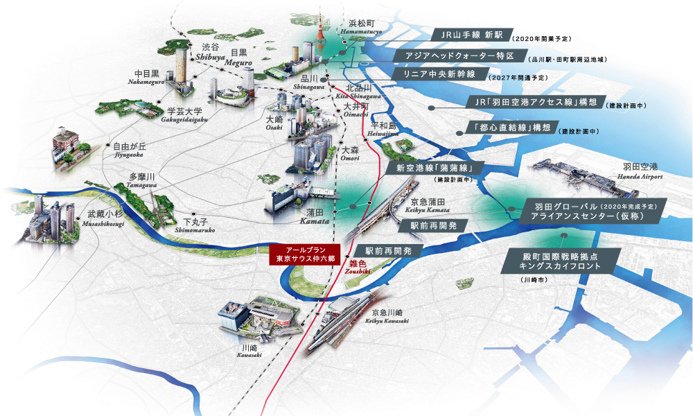 東急多摩川線と京急空港線をつなぐ新線の構想が新空港線「蒲蒲線」。これが開通すると「渋谷」駅から羽田空港へ30分以内のアクセスが可能になります。また、城西・城北エリアからのアクセスや大田区内の電車移動も便利になり、さらなる発展が期待されます。