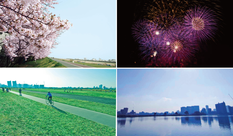 春、多摩川六郷橋緑地の土手に沿って桜が咲き誇り、散策する人々の目を愉しませてくれます。夏は、大田区の平和都市宣言を記念して開かれる「花火の祭典」。秋には、河川敷の野球場・テニスコート・サッカー場で多くの人々がスポーツに興じ、やがて静寂の冬景色を迎えます。身近で四季折々の美しい表情が見られるのが多摩川の醍醐味といえます。