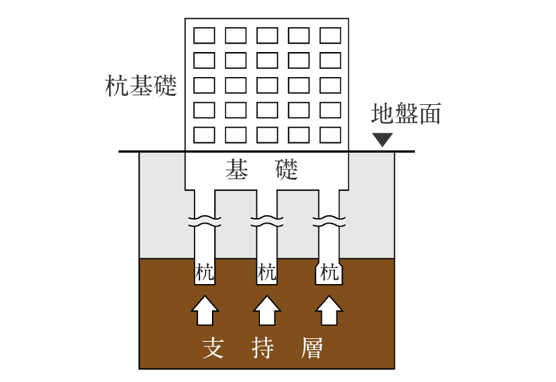 - 「ディアナコート学芸大学翠景」では、合計28本の場所打ちコンクリート杭を地中深く(深度約17m)にある支持層に貫入して支持しています。これにより通常時には、建物をしっかり支え、地震時には地震に抵抗しうる強度と剛性を確保しています。