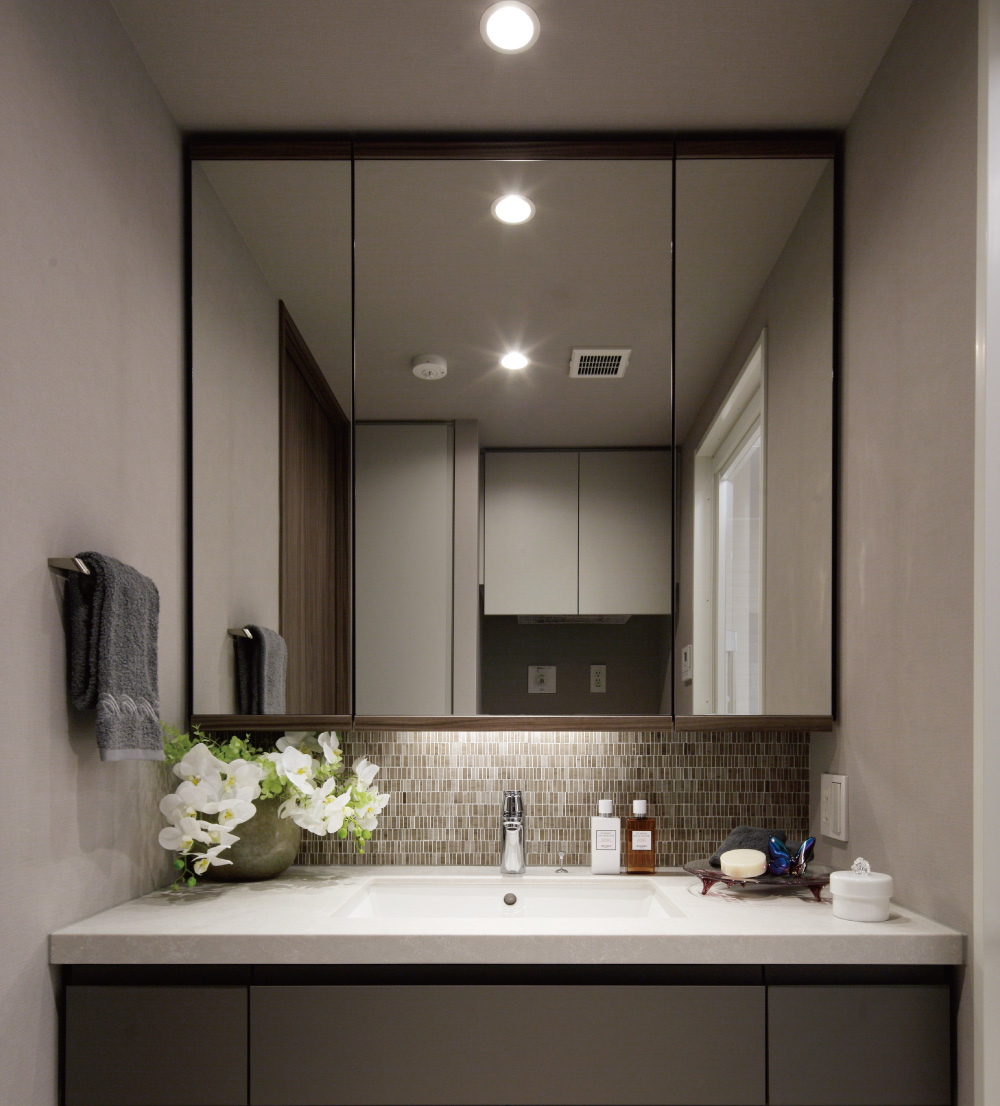 カウンターと鏡 - トイレにはスタイリッシュな手洗いカウンターを標準装備。鏡があるので、ゲストが人目を気にすることなくお化粧直しができます。水栓はデザイン性が高いドイツ・グローエ社製自閉式水栓です。※K、Lタイプはボウル・水栓の形状が異なります。
