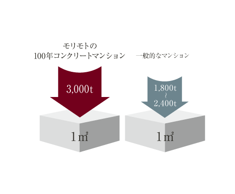 - 建物を支える柱、梁、床、壁などには、鉄筋コンクリート造を採用しました。一般に使用するコンクリートの設計基準強度の18〜24N/㎜(1㎡あたり約1800〜2400トンの圧縮に耐える性能)を上回る約30N/㎟以上としています。最大で1㎡あたり約3000トンもの圧縮に耐える強度があります。※100年コンクリートとは、日本建築学会「建築工事標準仕様書」において「設計基準強度がFc30N/㎟であれば構造体の大規模な修繕をしなくても100年はもつ」といわれているものです。ただし100年という数値は理論値でマンションのメンテナンスが100年不要だということではありません。