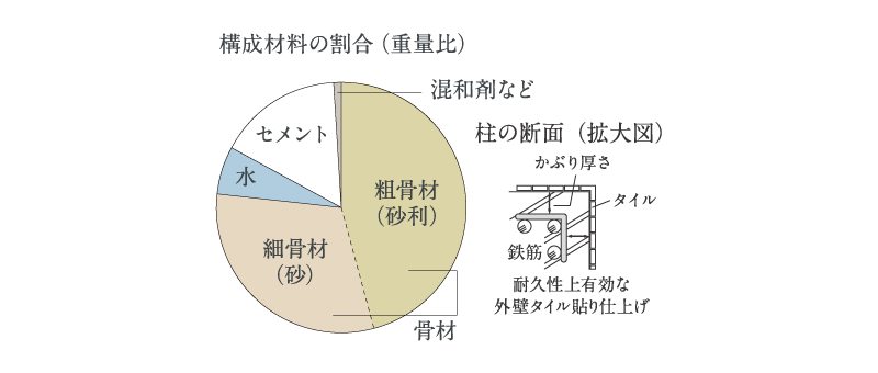 - 水セメント比を50%以下(杭及び非構造体コンクリートを除く)に設定。かぶり厚さもJASS5(建築工事標準仕様書)に準拠した高い耐久性をクリアしています。