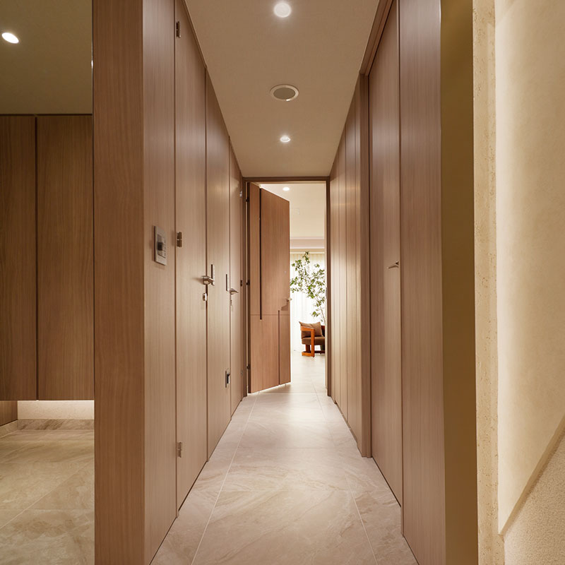 - 廊下壁の片面には、木目調パネル貼りを採用。毎日使うエントランスをラグジュアリーなスペースにして彩りを与えます。