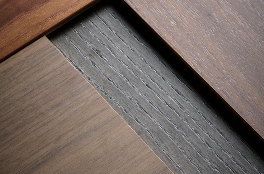 床:天然挽板フローリング - 本物の木が醸し出す心地よい質感と木目の美しさ。表面材に天然木を使用した「挽板フローリング」をご用意しました。無垢材と同様に、木の風合いと温もりを感じさせながら、複合材として優れたメンテナンス性を叶えます。また、建具には原木を薄くスライスし貼り込んだ「突板」を採用。木目を厳選し、マットな仕上げとすることで美しく滑らかな質感を実現しました。時を重ねて深まってゆく色や艶など経年変化も楽しめます。