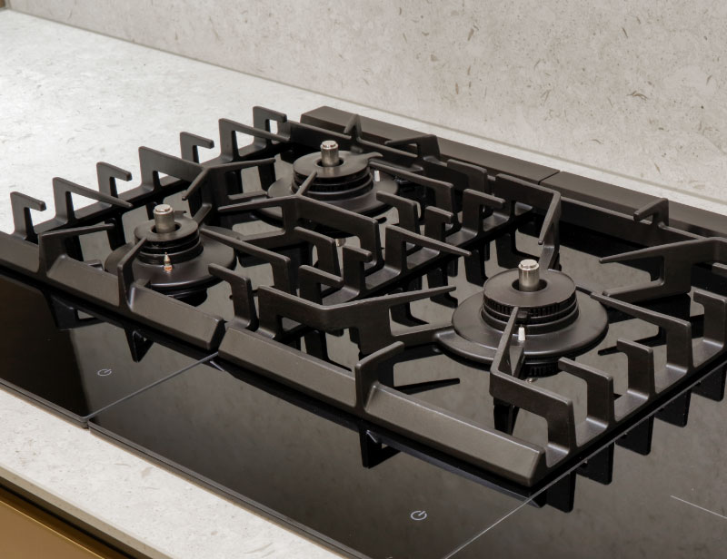 - 漆黒のブラックガラスと堅牢なステンレス五徳が漂わせる洗練された佇まい。強火から弱火まで自在に調整できる高性能バーナーとタッチ操作のスマートなデザインが魅力です。※標準は1口ガスと2口ガスのドロップインコンロの組み合わせになります。