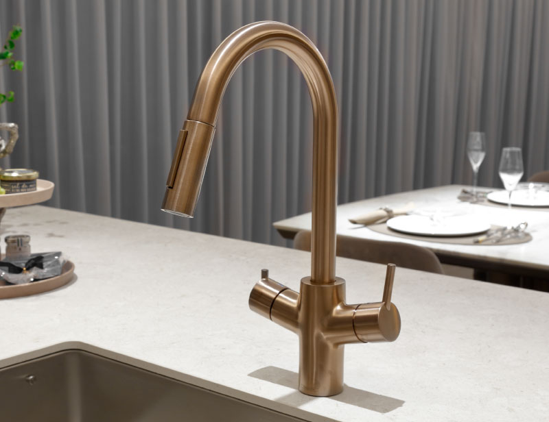 - キッチン水栓は上質なデザインと高機能を両立させたビルトインタイプ複合水栓。ホースを引き出せるのでシンク内の洗浄も簡単です。水栓のカラーはブラッシュドレッドゴールドを採用しました。(メイスイ・ハンスグローエ共同開発)