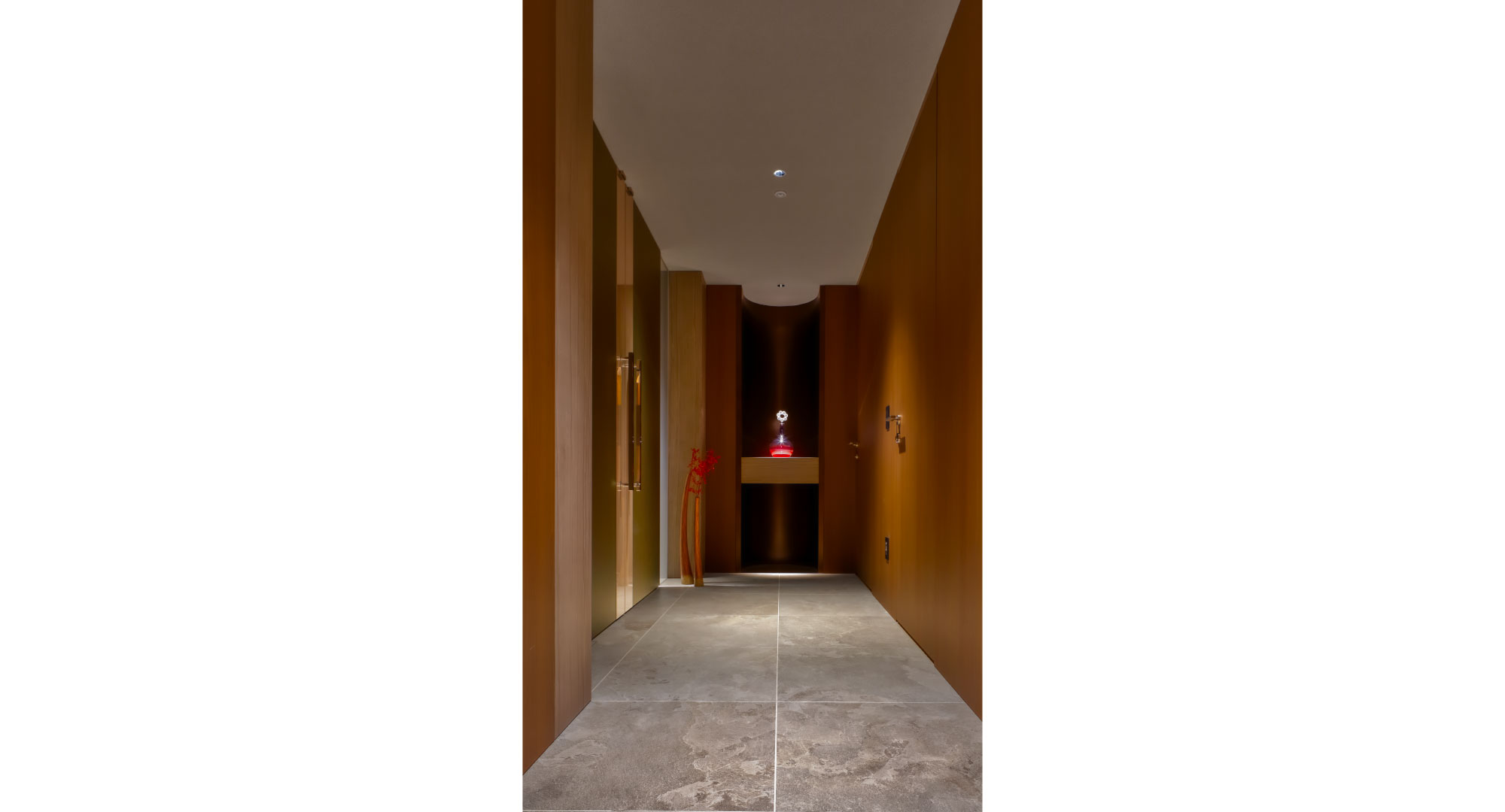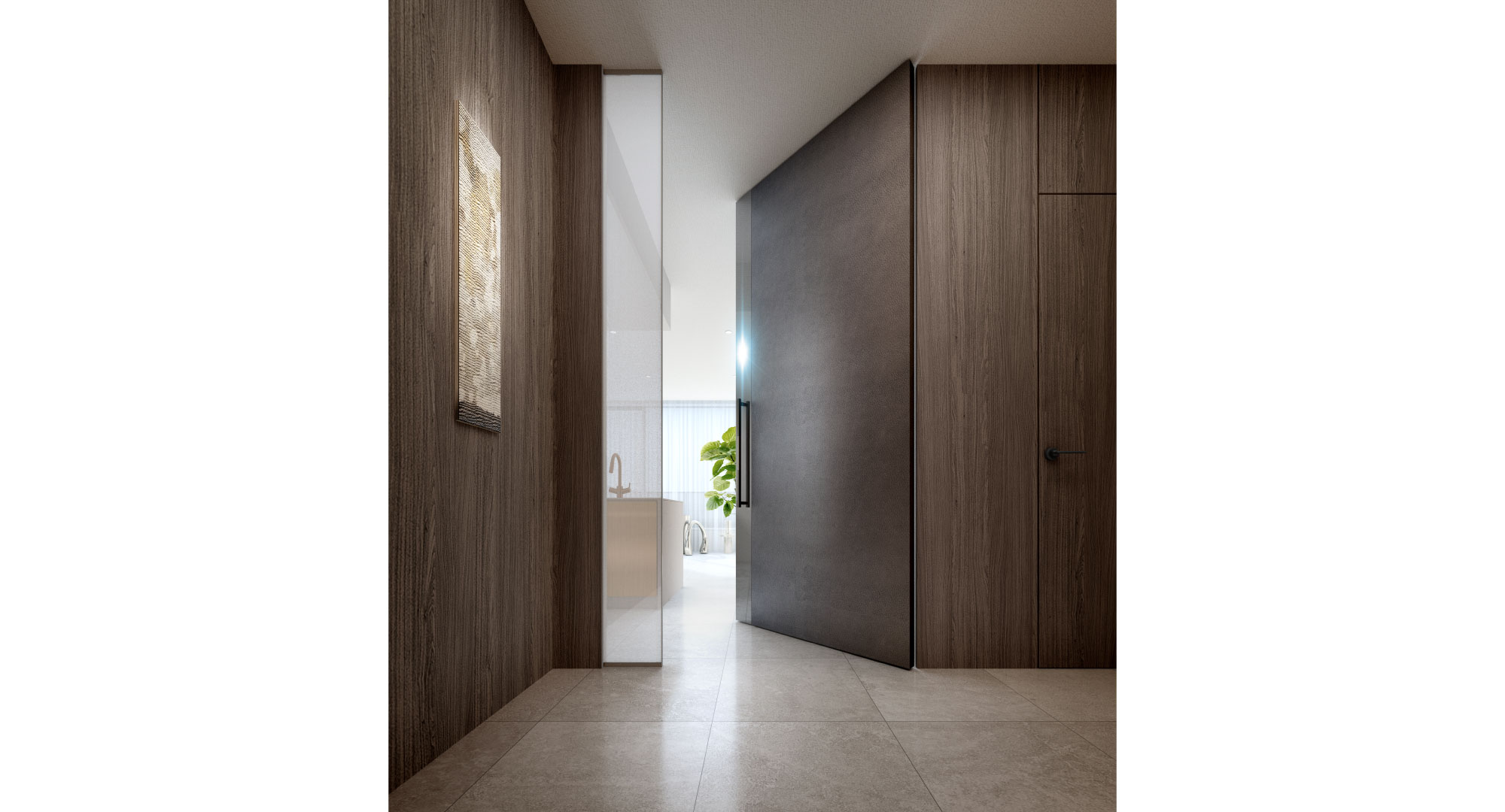 - リビングには再生レザーと鏡面塗装を融合させ、サスティナブルと上質感を調和させたフロアヒンジ建具をデザイン。質感の異なるマテリアルの組み合わせで高級感を描き出しました。サイドにはファブリックガラスが並び、ホールとリビングを緩やかに繋ぎます。