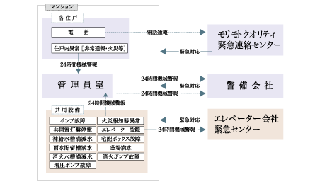 - 【マンション生活で"どうしても心配"になる防災に対しての備え】各住戸からの各警報(非常通報)は、管理員室を拠点として、24時間態勢となっておりますので、各住戸より異常信号が発信された際は、警備員が現場へと出動致します。又、建物内の設備異常(各ポンプ・エレベーターの故障)についても、24時間体制で待機しておりますので、異常が発生した際には緊急要員が現場へと出動し、復旧作業を迅速に行います。不意の停電、断水、水漏れ等、私たちの暮らしは、ときとして突然のトラブルにみまわれます。昼間ならまだしも、トラブルの発生が深夜だったら?モリモトクオリティ緊急連絡センターにご通報下さい。緊急出動を必要とする場合は、一次対応に当たります。尚、緊急出動の一次対応には、費用はかかりません。(一次対応以降の修理・復旧に関しては専門業者を紹介、費用別途)※住戸内の非常警報は、警備会社へ通報されます。