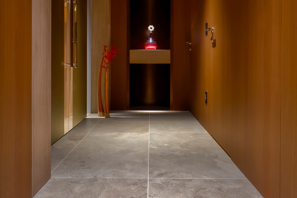 玄関廊下/600角タイル貼り・廊下壁両面突板パネル
